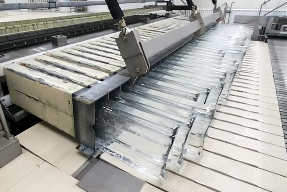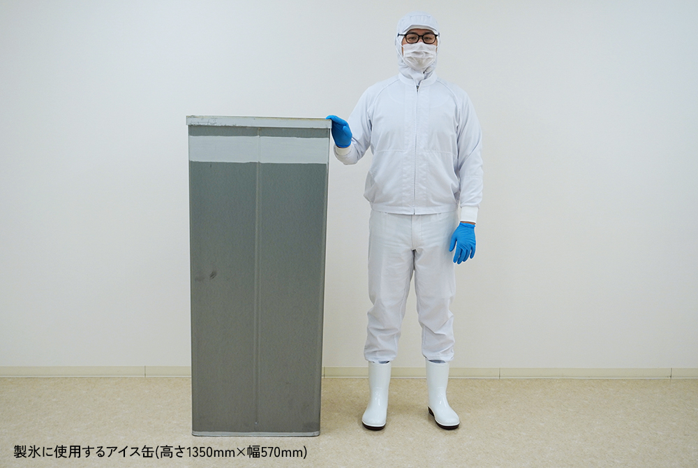 最新鋭のラインでアイス缶製法(カングリッド製法)によりゆっくりと一定の温度で製氷することで、大きな結晶の氷ができ、冷蔵庫で作る氷と比べ「解けにくい氷」が作られます。また、効率よく製氷・砕氷を行う為、一般的なサイズ(135キロ缶)よりスリムなアイス缶を使用し製氷しています。